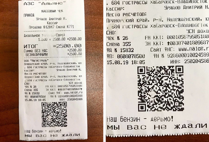 «Чоловік скинув фото чека з заправки. Не знаю, настільки все погано на цій заправці або ж касир так жартує»
