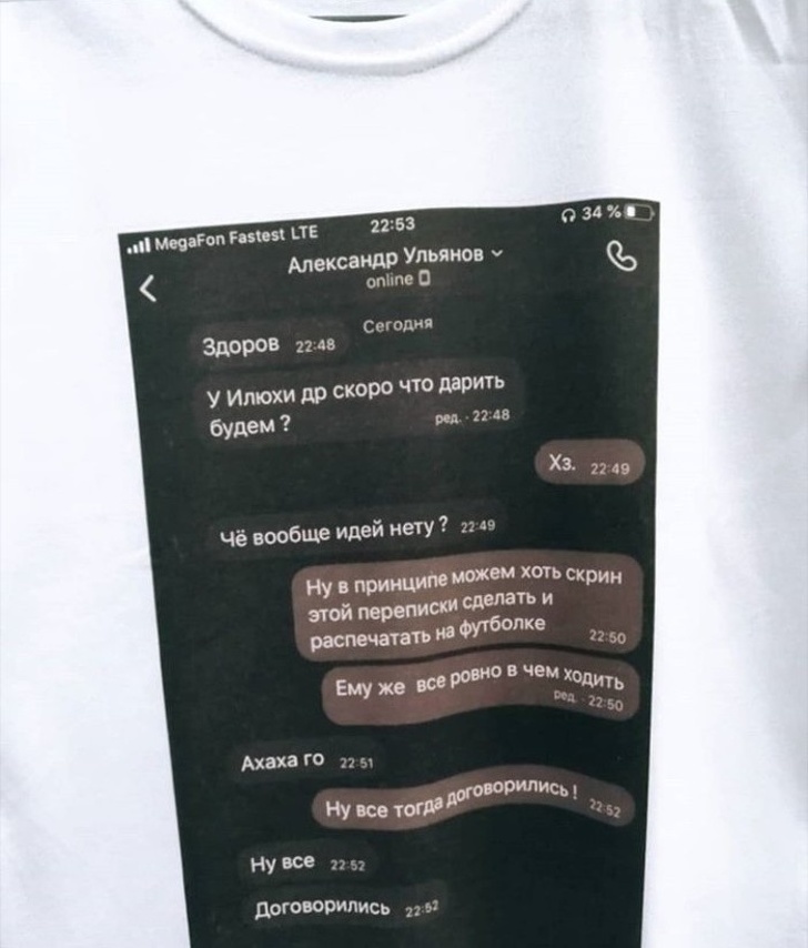 7. Подарунок на день народження — футболка зі скріншотом листування з обговоренням подарунка