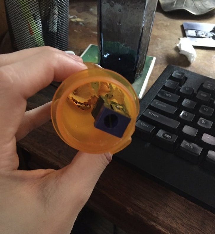 12. «Я приклеїв точило всередину пляшки з-під таблеток, щоб не точити олівці над сміттєвим відром»