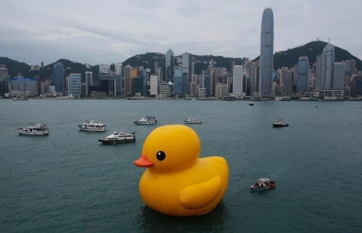 На перший погляд здається, що це витівки майстрів фотошопу. Але насправді гігантський каченя — це творіння голландського художника Флорентіна Хофмана. Каченя подорожує по світу: він вже побував у Сіднеї, Осаці, Окленді і Гонконгу. На фотографії каченя пливе по гонконгської гавані Вікторія. За словами художника, гігантська качка створена для того, щоб викликати посмішку на обличчях людей.