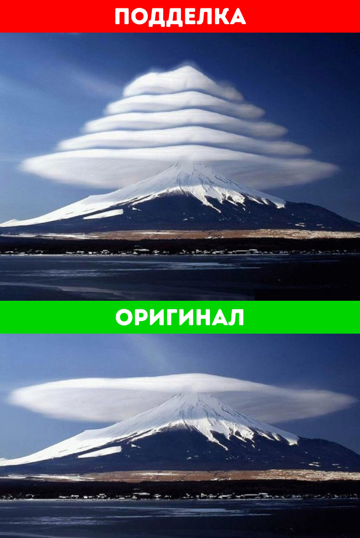 У мережі фотографію супроводжували історією про те, що одного разу піраміда з п'яти хмар утворилася над горою Фудзі. Виглядає, звичайно, ефектно. І хоча лентикулярні хмари бувають шаруватими, на оригінальній фотографії хмара було одне.