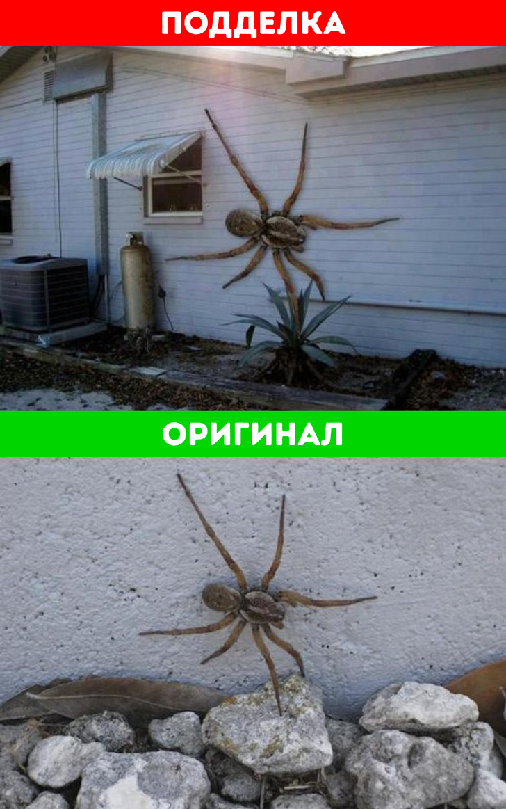 На щастя для людей, які страждають арахнофобией, ця фотографія — підробка. Розмір найбільших у світі павуків порівнюють з долоню дорослої людини. Знімок зробив фотограф Поль Санта-Марія в 2011 році, коли виявив на задньому дворі свого будинку у Флориді павука-вовка. Він сфотографував будинок і помістив на його стіну павука, збільшивши останнього до гігантських розмірів. Пізніше фотограф завантажив підробку на Facebook і додав до неї підпис: «Ти впевнений, що хочеш переїхати у Флориду?»