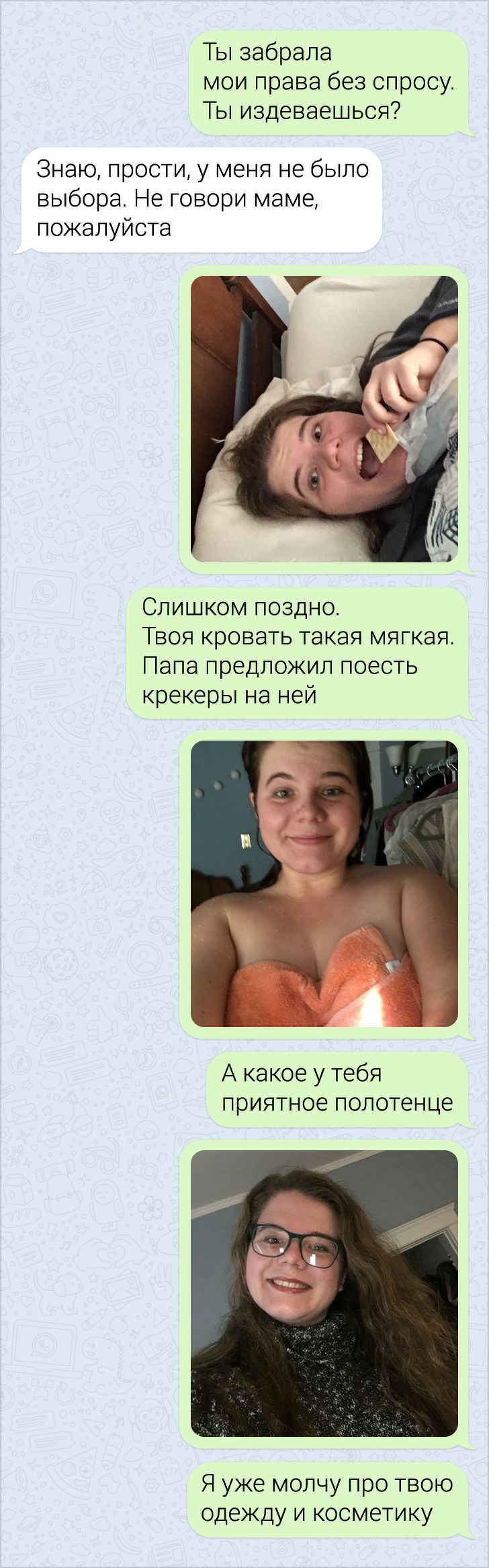 16. «Моя молодша сестра вкрала мої водійські права і зірвалася в подорож в Техас. Батьки запропонували мені взамін покористуватися її речами»