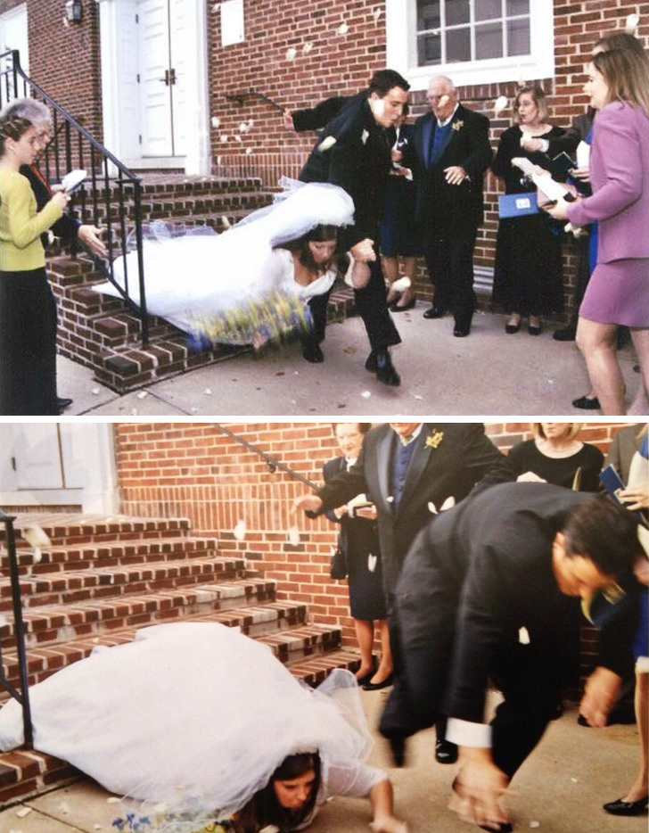 23. «Фотограф підганяв нас, і, коли мені залишалося подолати останні три сходинки, я наступила на поділ сукні і впала. Чоловік безуспішно намагався утримати мене, влетів у натовп і порвав штани»
