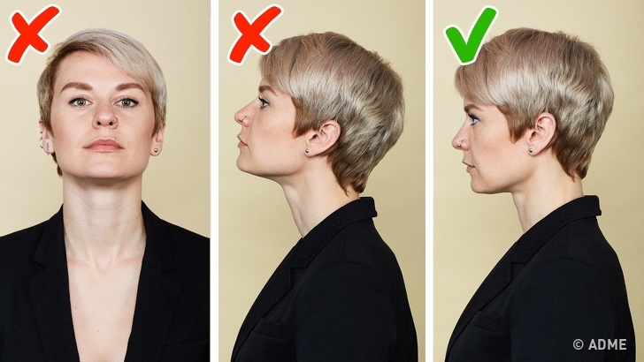 Втім, сильно опускати голову, а тим більше відводити її назад теж не слід, інакше ви ризикуєте отримати подвійне підборіддя. Щоб нижня частина обличчя здавалася більш чіткою, потрібно злегка виставити підборіддя вперед і трохи опустити голову вниз.