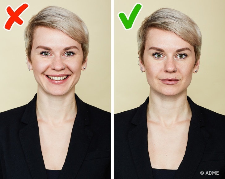 Згідно сучасним стандартам, прийнятим у більшості країн, широка посмішка недоречна для фото на документи, так як може спотворювати риси обличчя. Однак легка усмішка цілком допустима — для цього потрібно трохи підняти куточки рота.