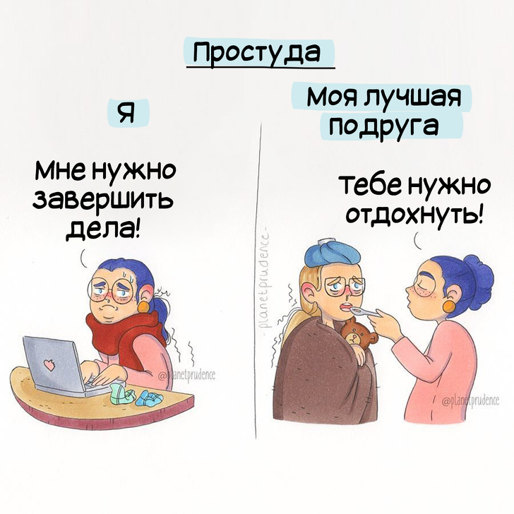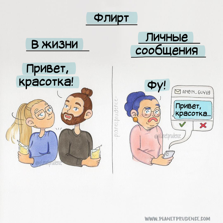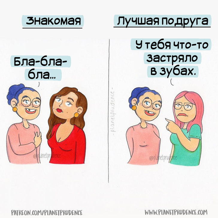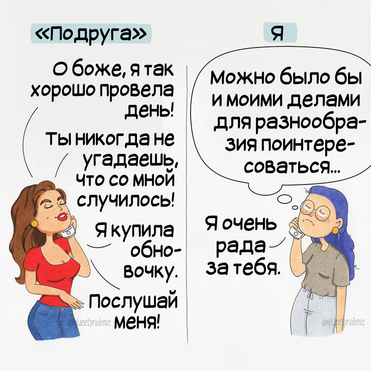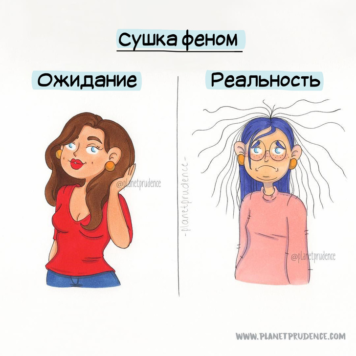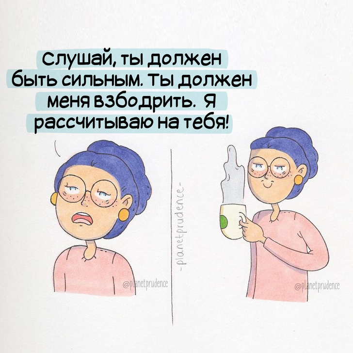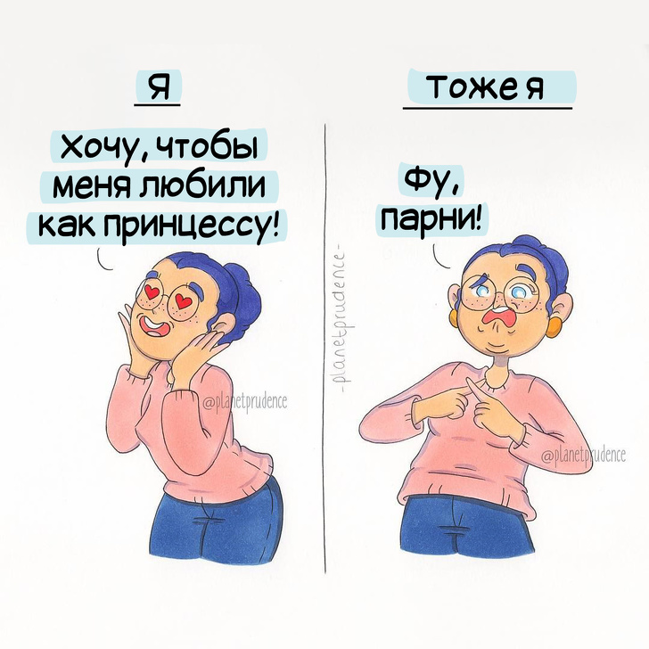 Бельгійська художниця, відома під псевдонімом Пленет Пруденс (Planet Prudence), малює до болю правдиві комікси про щоденні труднощі і радощі, вічних примхи та особливості прекрасної статі. Зараз її сторінка в Instagram налічує вже без малого 700 тисяч передплатників, картинки набирають десятки тисяч лайків, а значить, багато хто жінки, від мала до велика, дійсно дізнаються в її яскравих життєвих замальовках самих себе.