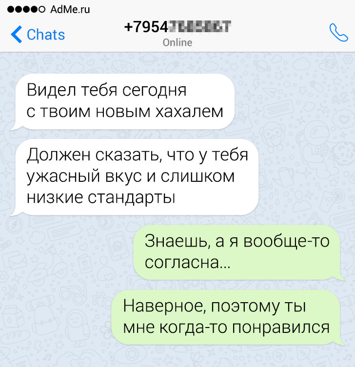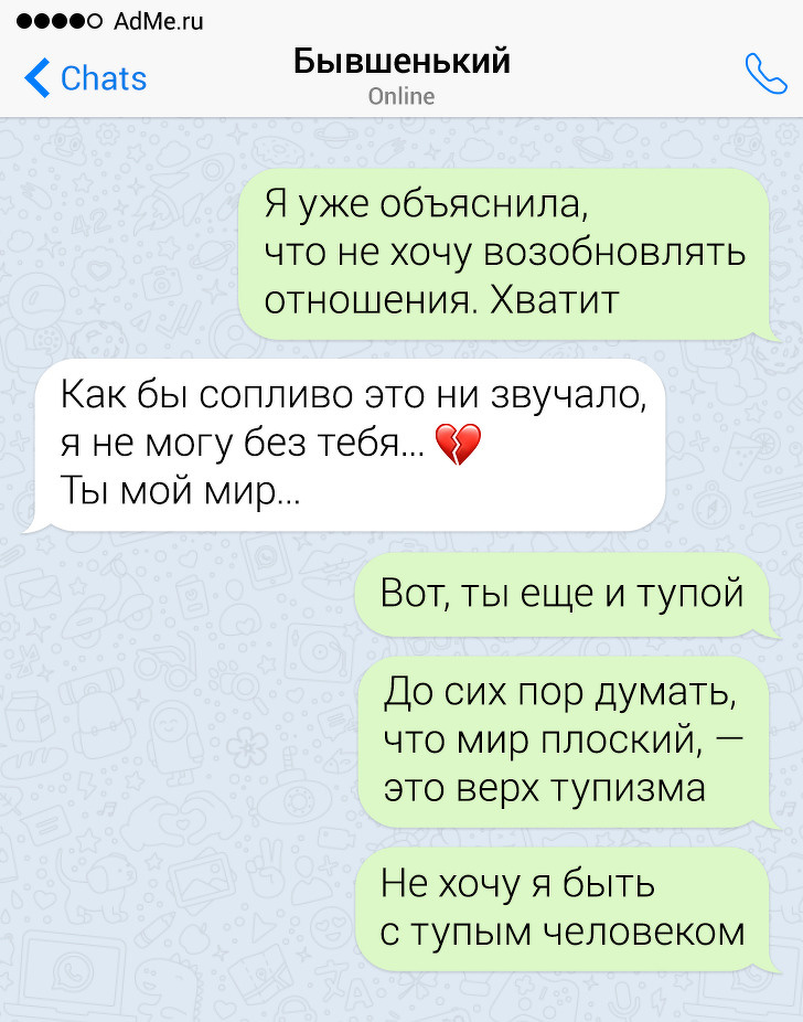 У цій статті Social.org.ua захопився жіночої спритністю і творчим підходом у спілкуванні з впертими колишніми і непонятливыми кавалерами. Адже в подібній ситуації досить складно зберегти самовладання і відповідати, не тільки не опускаючись до прямих образ, але і підбираючи найбільш витончені й дотепні формулювання.
