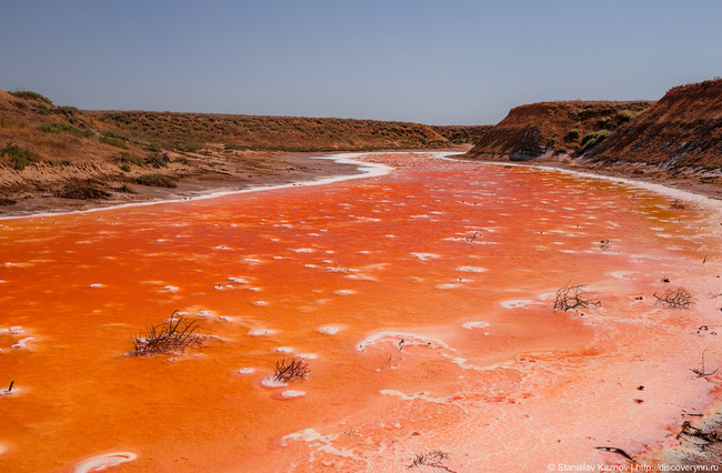 Річка Гірка, Астраханська область. Колір води змінюється від оранжевого до малинового з-за наявності оксидів металів у воді