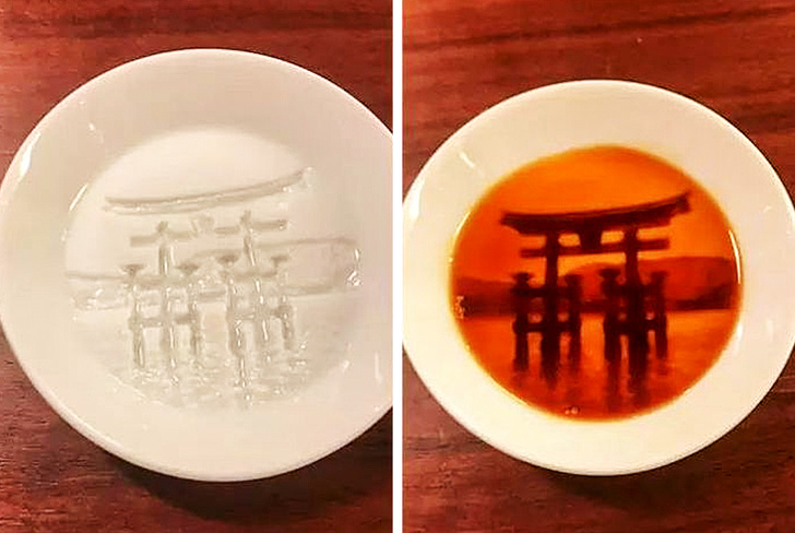 Об'ємне зображення синтоїстського святилища Іцукусіма проявляється на дні тарілки після додавання в неї соусу