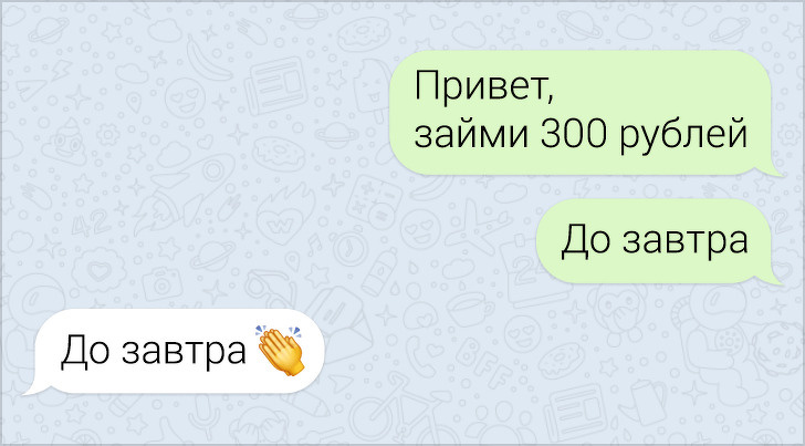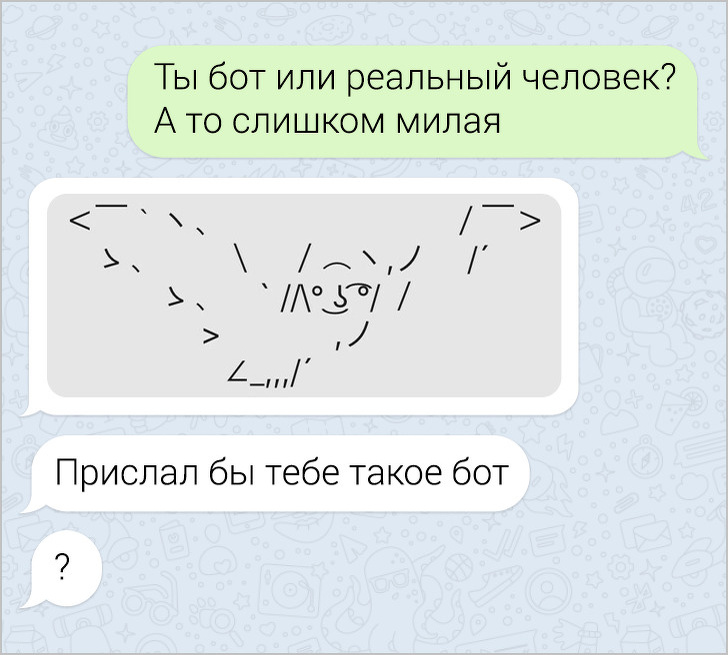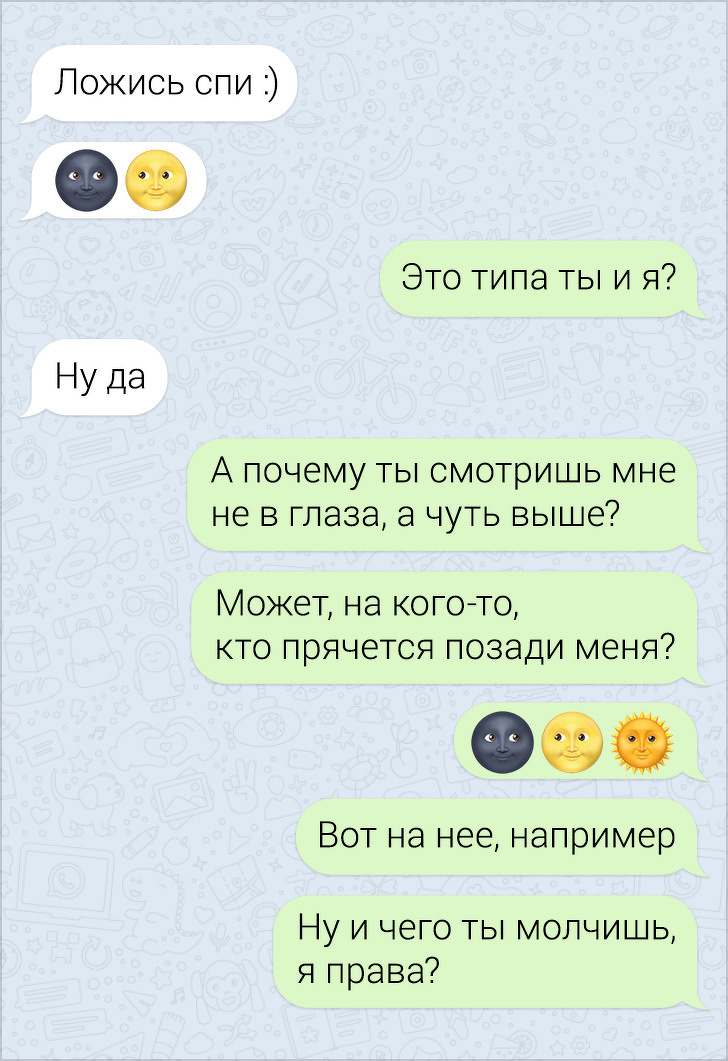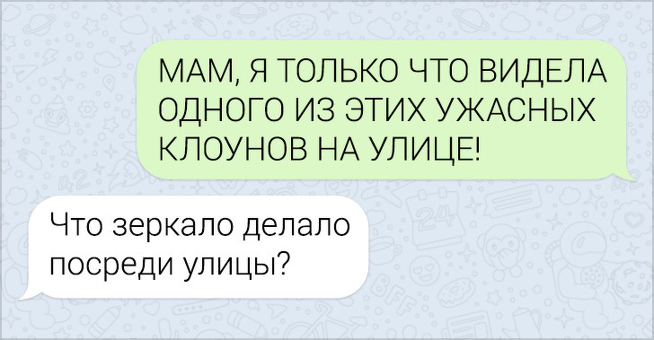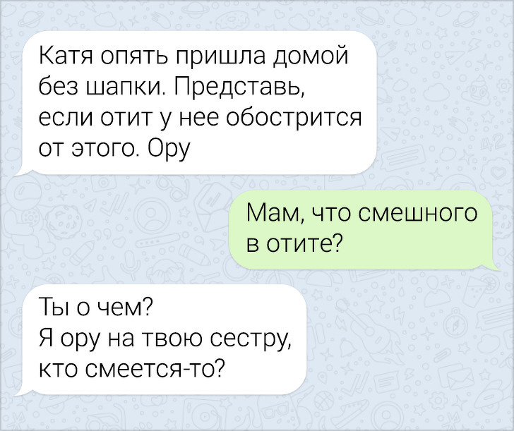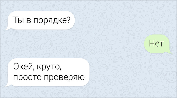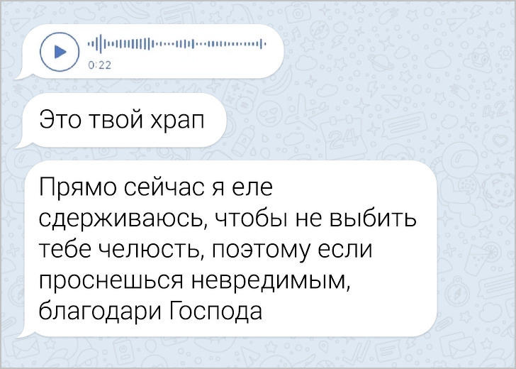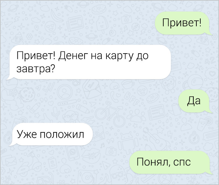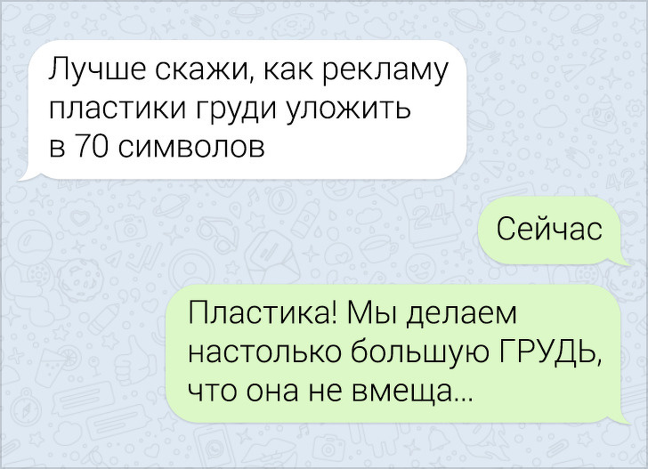СМС-листування вже давно пора зробити окремим літературним жанром. У них часто поєднуються і сарказм і іронія, і добродушні штуки, в результаті виходить така пекуча суміш, що хочеться її терміново «заскріншотіть». Друкарські помилки, гра слів, вдалі фотки у відповідь на звичайні репліки — це все те, за що ми любимо більше СМС, ніж голосові повідомлення.