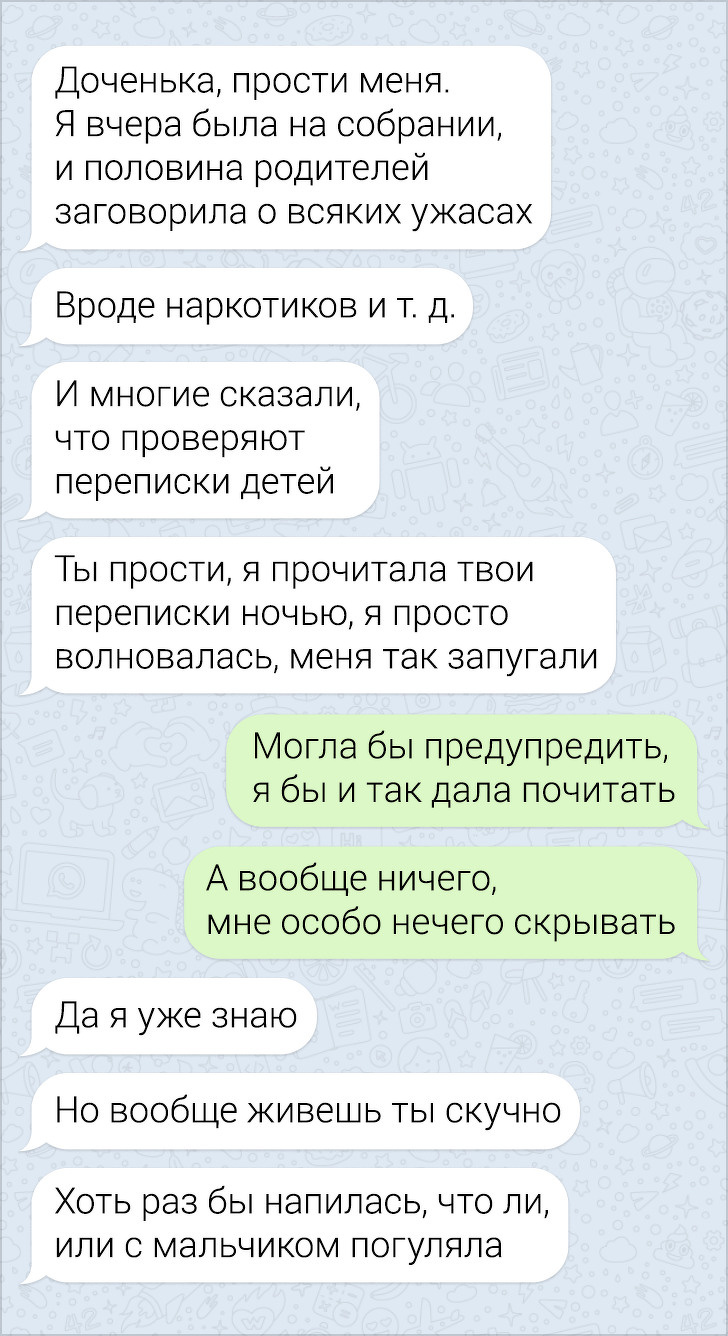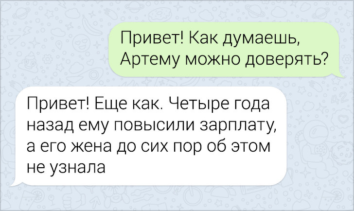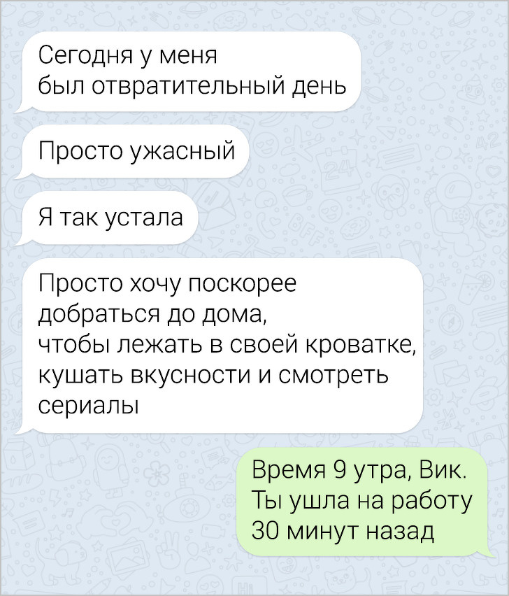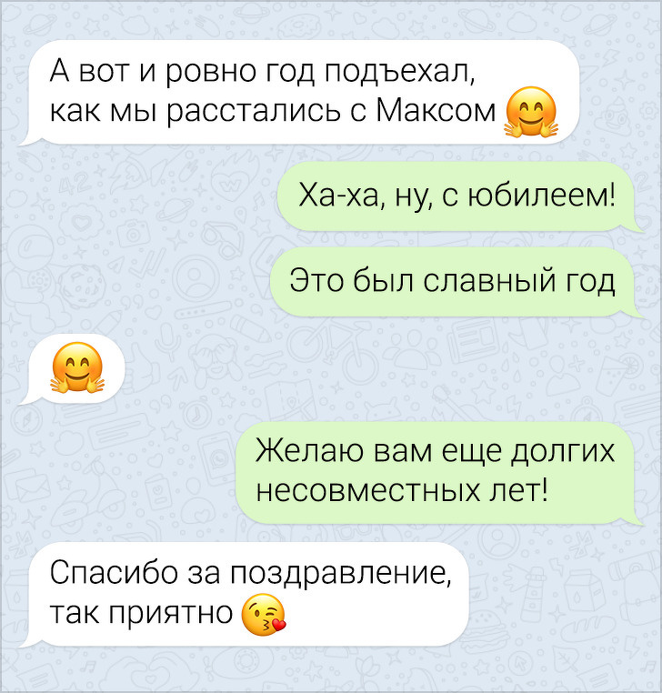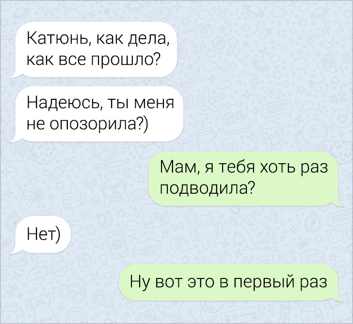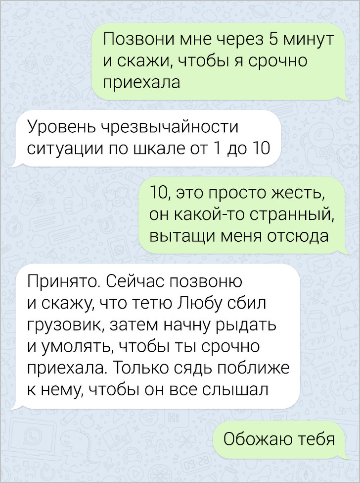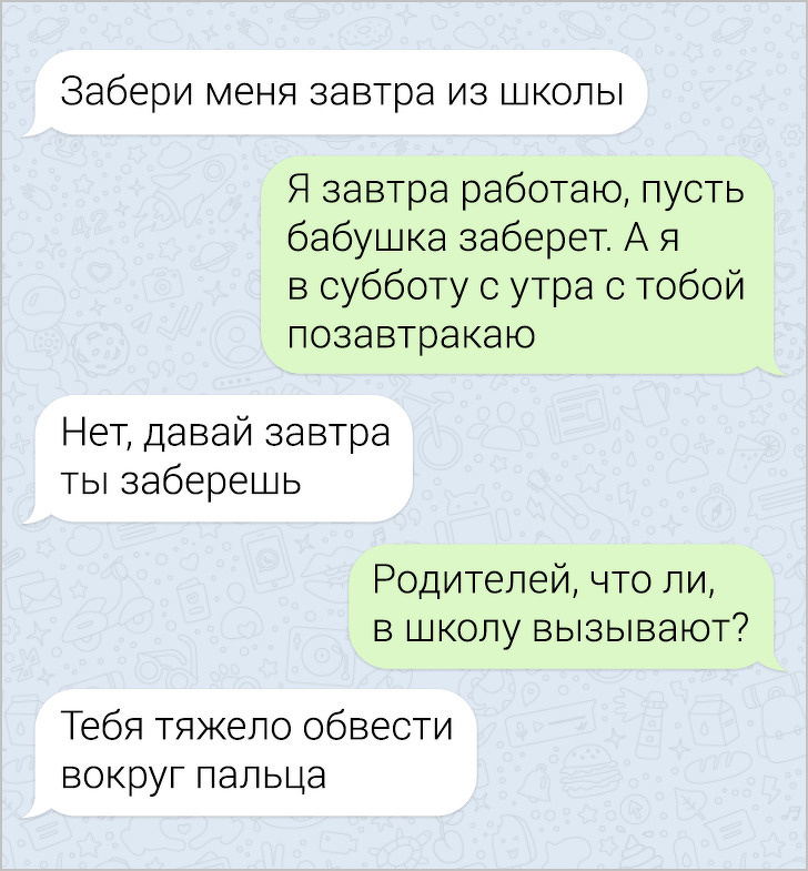 СМС-листування вже давно пора зробити окремим літературним жанром. У них часто поєднуються і сарказм і іронія, і добродушні штуки, в результаті виходить така пекуча суміш, що хочеться її терміново «заскріншотіть». Друкарські помилки, гра слів, вдалі фотки у відповідь на звичайні репліки — це все те, за що ми любимо більше СМС, ніж голосові повідомлення.