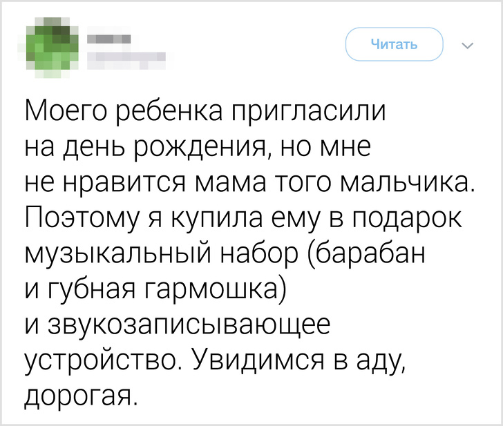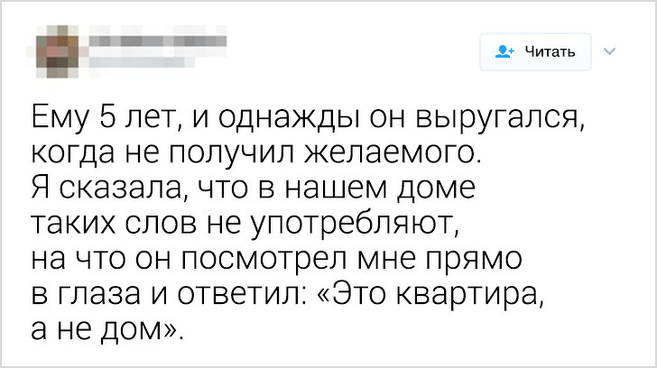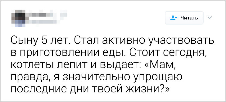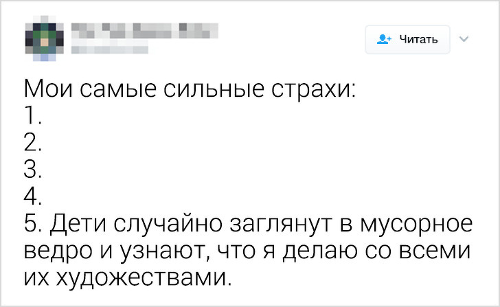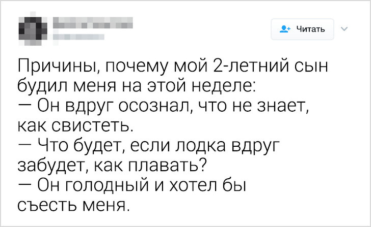 Є у мене одна дуже недовірлива знайома. Одного разу вона гуляла з 6-річним сином і він вдарився головою об щось на дитячому майданчику. На голові навіть шишки не було, але знайома злякалася, що у нього може бути струс мозку. Навіть після того, як вона поклала дитину спати, час від часу вона заходила в його спальню, будила сина і запитала, як його звуть. Коли вона в черговий раз зайшла до нього, то побачила стікер, приклеєний до його чола. На стікері маркером було написано: «Мене звуть Артем». ©Shutok.ru / Pikabu