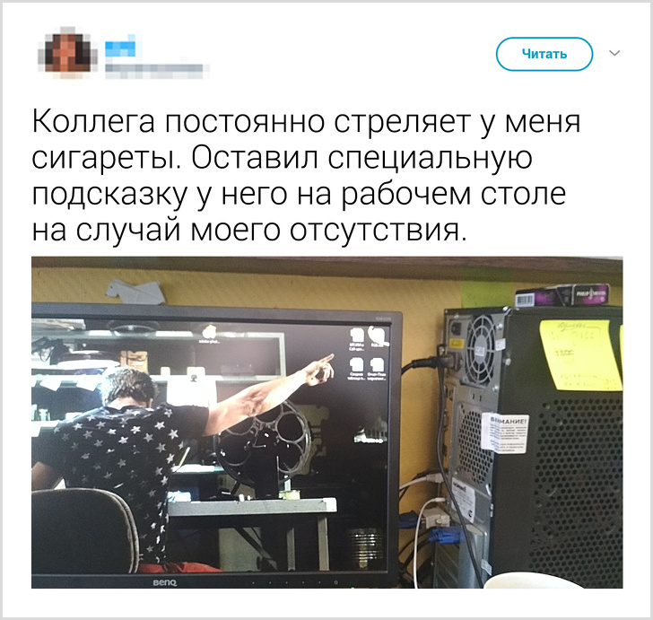 - У багатьох на роботі є така людина — «пригости сигареткою». То він кидає палити, то забув, чи то Місяць з Марса впала — в загальному, вічний стрілок. Багато в нашому колективі скриплячи зубами ділилися, а під кінець місяця ми «позичили» у нього грошей. І повернули блоками сигарет. Це вираз обличчя не передати словами. komix32 / Pikabu