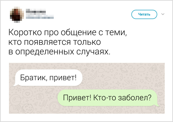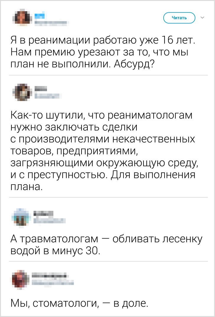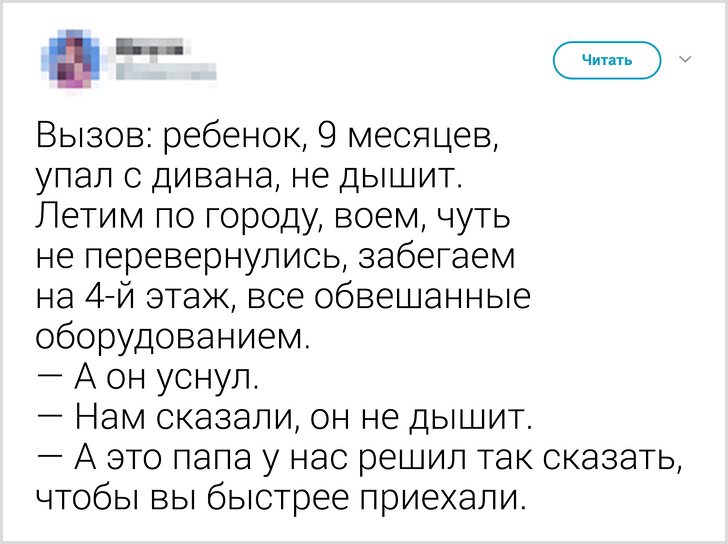 - Користувач під ніком @Esterly розповів, до якого маразму можуть доходити виклики: «Дзвінок від чоловіка, 40 років. Привід виклику: „Погано в під'їзді“. Насправді з'ясувалося, що дружина образилася і не пускає його в квартиру. Одному йому стало тоскно. Він просив нас вибити двері або відвезти його в лікарню, де веселіше».