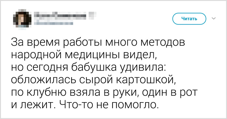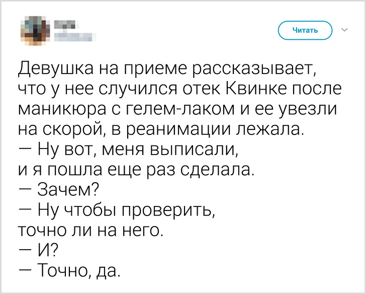 - Мужні чоловіки, зашивающие рани прямо на собі, зустрічаються не тільки в кіно. Іноді лікарям доводиться переконувати пацієнтів прийняти їх допомогу, роз'яснюючи всі можливі наслідки. Дівчата теж не відстають: користувач під ніком @bubukanavorotn1 поділився випадком, як молода дівчина з артеріальною кровотечею питала, чи встигне в перукарню до 11:00.