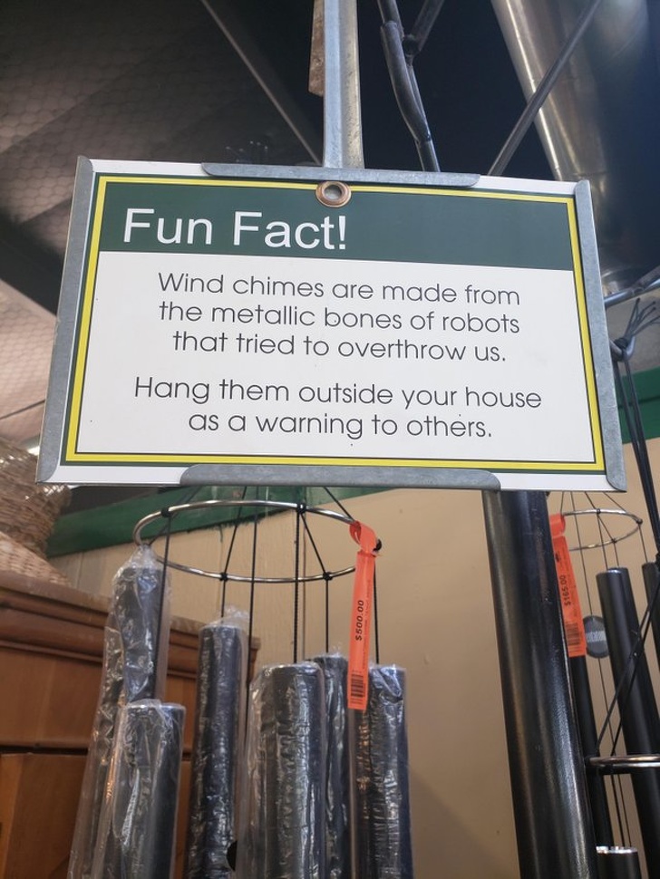 «Музика вітру зроблена з металевих кісток роботів, які намагалися повалити нас. Повісьте її біля свого будинку як попередження для інших».