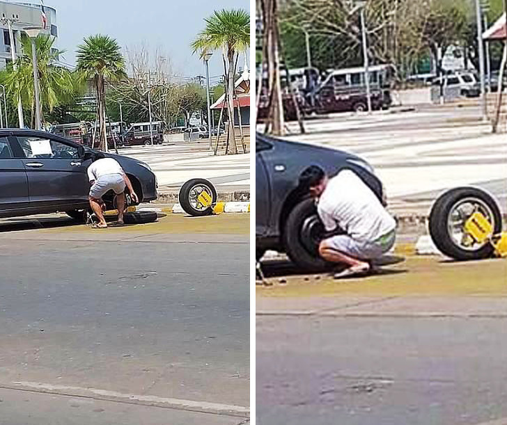 Цей хлопець вирішив не платити штраф, а просто замінив колесо, на яке поставили колодку