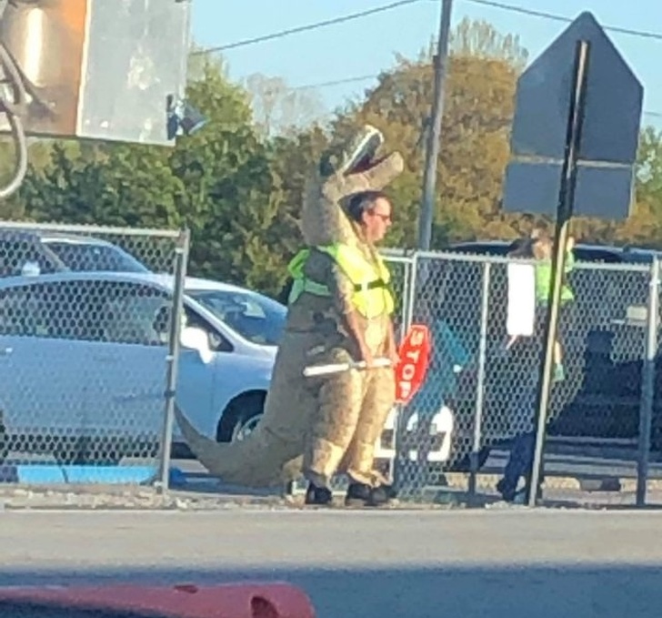 «Це директор школи, де навчаються мої діти, в костюмі Ти-Рекса. Навіть не уявляю, який спір потрібно було програти, щоб сталося таке»