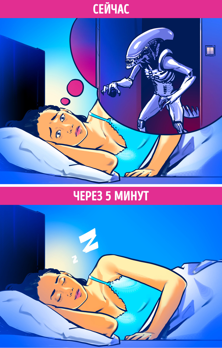 - Трюк, який працює зі мною завжди: уявіть, що до вас в будинок пробрався психопат, який нападає тільки на тих, хто не спить. Вам потрібно прикинутися, що ви спите, і тоді він піде. Пристосуйте свій подих, розслабте лицьові м'язи, намагайтеся особливо не рухатися.