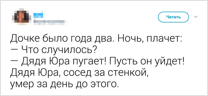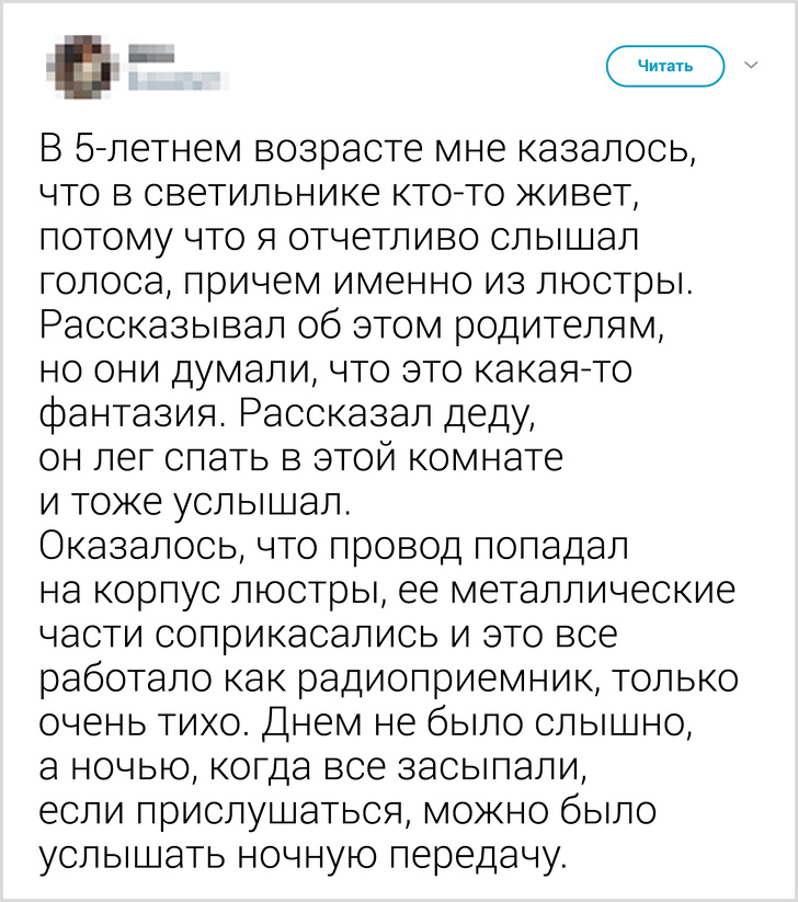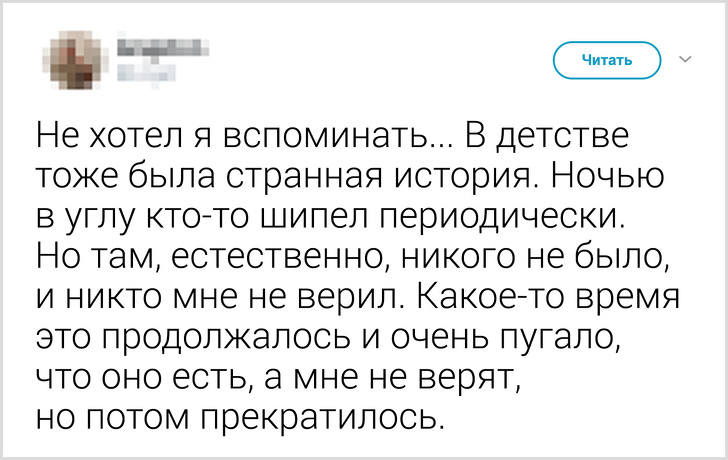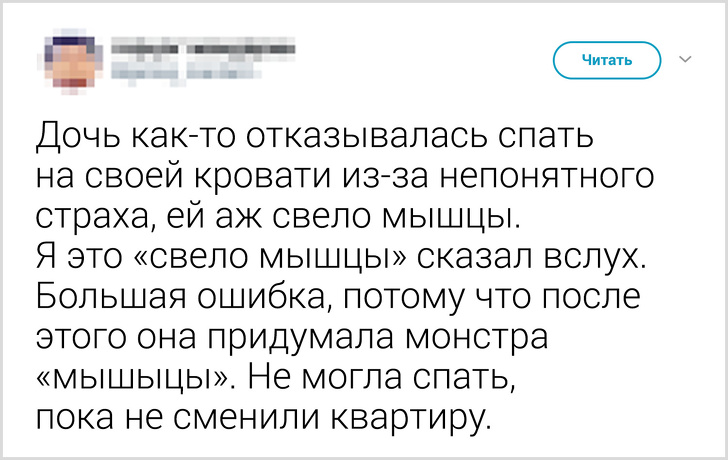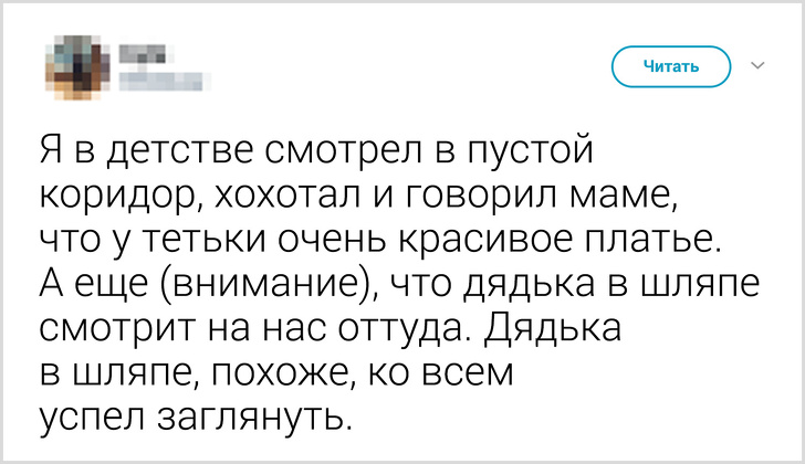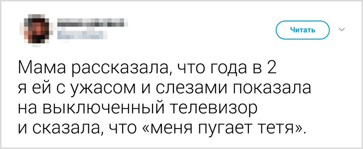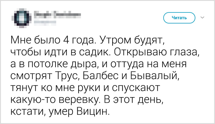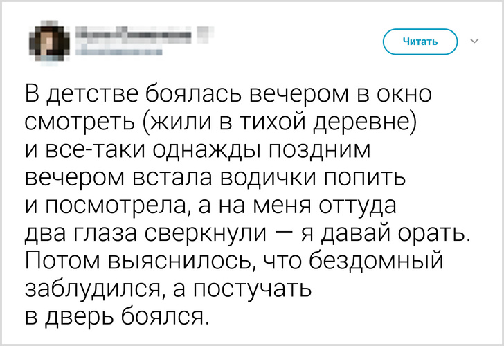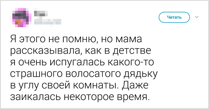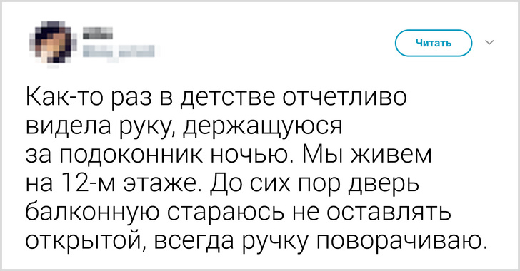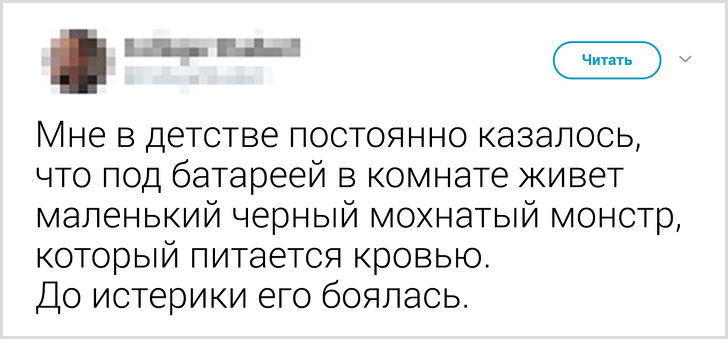 Напевно кожен з нас в дитинстві чогось боявся. Кого-то лякали «тітоньки з телевізора», хтось лив сльози за вигаданих персонажів, яких ніхто, крім самої дитини, не бачив, ну а деякі відчували страх перед чорними чудовиськами, які жили під батареями. Так от, користувач твіттера під ніком Генси створив тред, присвячений дитячим страхам і містичним речей, що відбувалися з маленькими фантазерами. Потрібно сказати, що він зібрав тисячі лайків і відгуків.