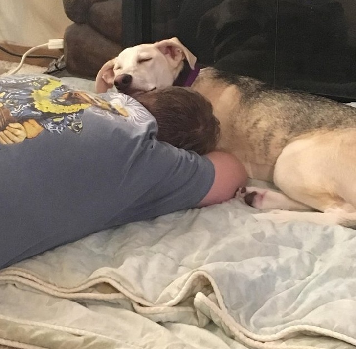 «Чоловік постелив для нашої нової собаки ковдру на підлозі, а сам ліг неподалік, щоб вона не боялася, але сама вирішила, коли підійти. Вона лягла поруч з ним і використовувала його голову замість подушки»