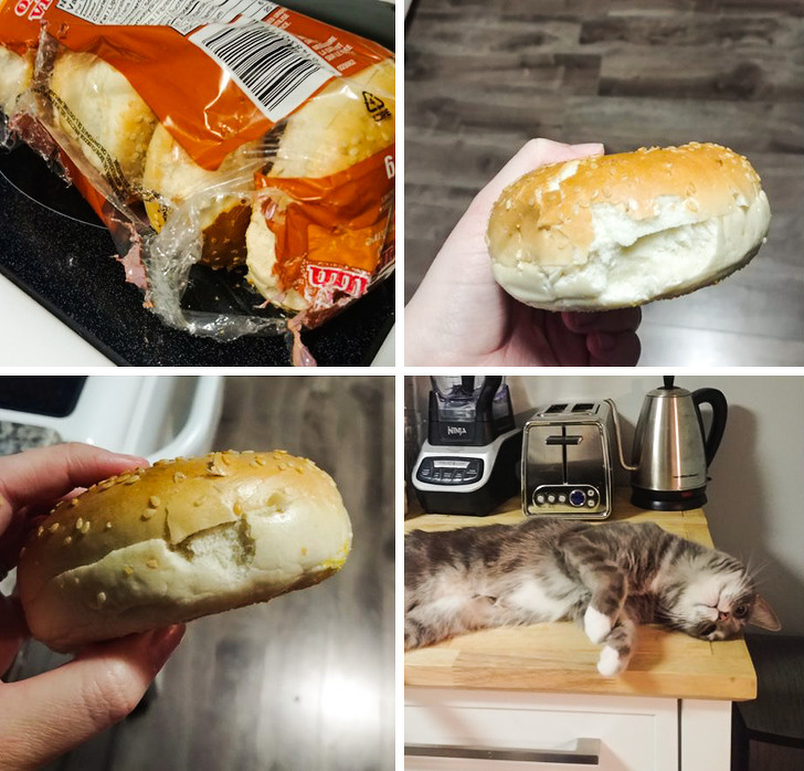 «Кішка розлютилася, що ми не прийшли додому до вечері і не погодували її. Тому вона розірвала упаковку з булками і відкусила по крихітному шматочку від кожної»