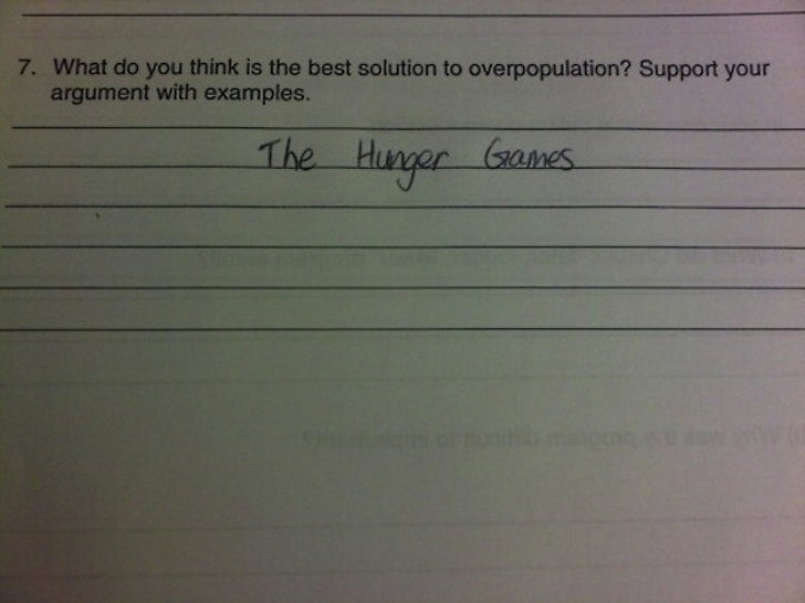«Як ви думаєте, як краще рішення для проблеми перенаселення?» «Голодні ігри».
