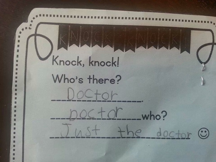 «Тук-тук». «Хто там?» «Доктор». «Доктор Хто?» «Ні, просто доктор».