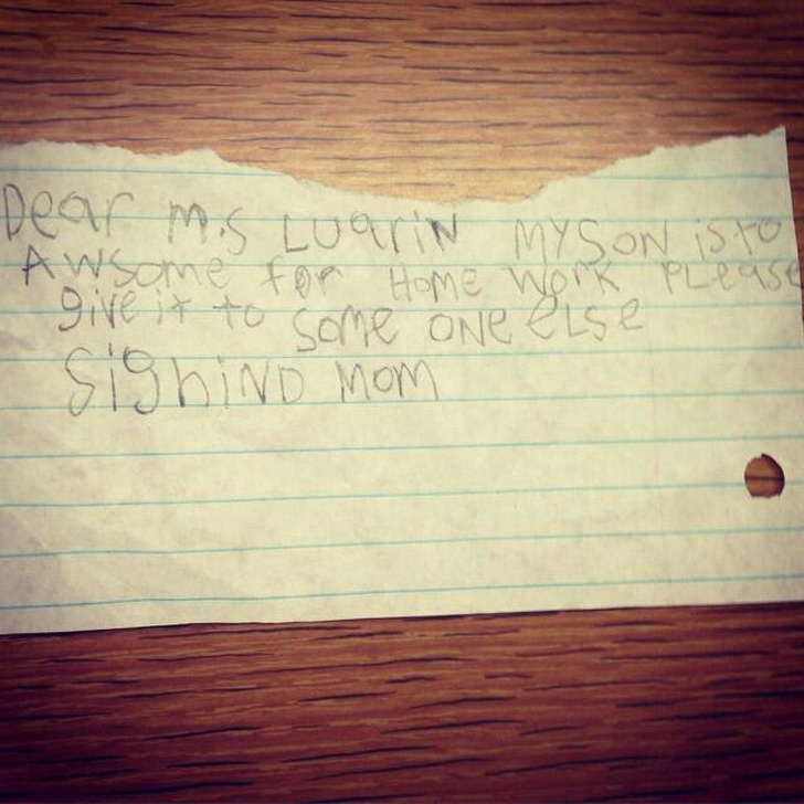 «Люба міс Лагрин! Мій син дуже хороший для того, щоб робити домашню роботу. Будь ласка, задайте йому що-небудь інше.