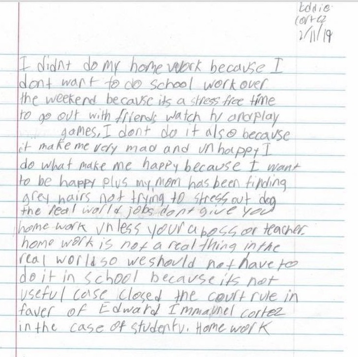 «Я не зробив домашку, тому що не хочу робити шкільні справи на вихідних. Це час мені потрібно для відпочинку, прогулянок з друзями, перегляду телевізора і ігор. А ще я не зробив завдання тому, що від нього я злюся і сумую. Я займаюся тим, що робить мене щасливим, тому що хочу бути щасливою. А ще моя мама стала знаходити у себе сиве волосся і намагається не переживати з-за цього.