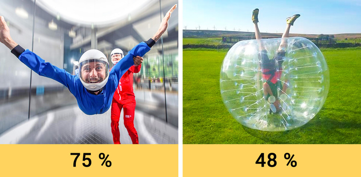 Екстремальні розваги вибрали 85 % опитаних. Абсолютні лідери — поїздка на квадроциклі і політ в аеротрубі. Трохи менш популярні стрибок з парашутом, квести і роупджампінг. Також багатьом сподобалася ідея авіасимуляторів і спортивних симуляторів гірських лиж. А ось до чия популярність у світі зорбінгу (катання у величезній кулі по схилу або грі в ньому у футбол) люди поки ставляться насторожено, але зате це відмінний спосіб здивувати.