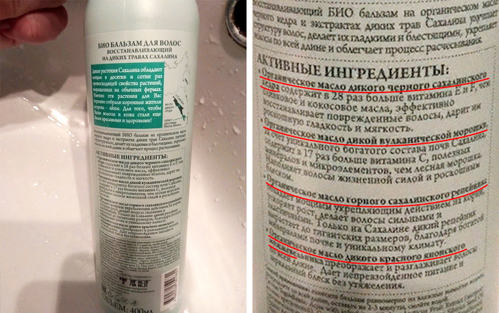 У цьому бальзамі для волосся виявилися масла чудових рослин: дикого чорного сахалінського кедра, дикого червоного японського ялівцю, гірського сахалінського будяків і дикої вулканічної морошки. Тільки ось у чому заковика: за словами екологів, вони нічого не чули про таких рослинах.