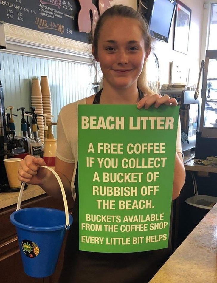«Пляжний сміття. Безкоштовний кави, якщо ви зберете відро сміття на пляжі. Відро можна взяти в кав'ярні. Навіть невелике зусилля допоможе».