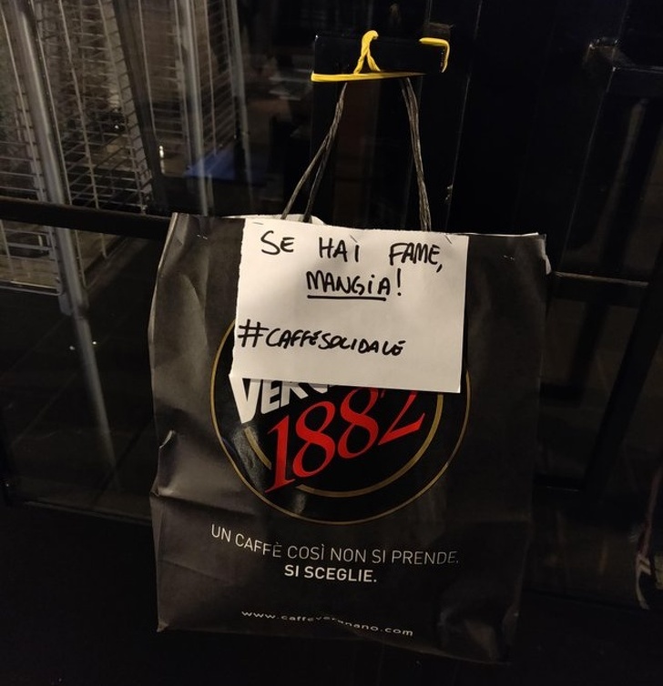 Пакет з продуктами, який повісили на ручку вхідних дверей магазину в Барі, Італія