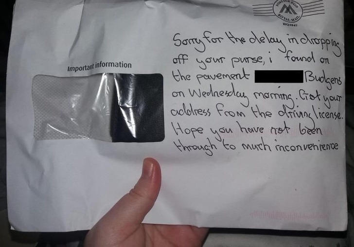 «Вибачте за затримку з доставкою вашого гаманця, я знайшов його на асфальті біля магазину Budgens в середу вранці. Дізнався вашу адресу з водійських прав. Сподіваюся, у вас не виникло великих незручностей».