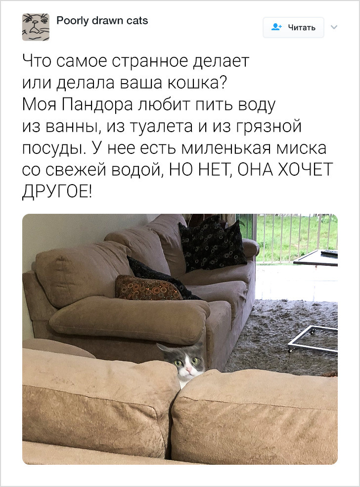 Тиждень тому дівчина з Бразилії створила тред, де запропонувала користувачам твіттера поділитися дивацтвами, які вони помічали у своїх кішок. До речі, ця бразилійка під ніком poorly drawn cats («погано намальовані кішки») вже встигла полюбитися інтернету своїми песимістичними малюнками хвостатих. Передплатники надсилають їй фото своїх улюбленців, а вона втілює їх образи на папері.