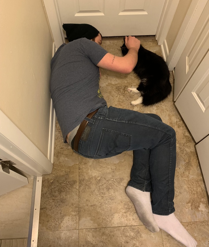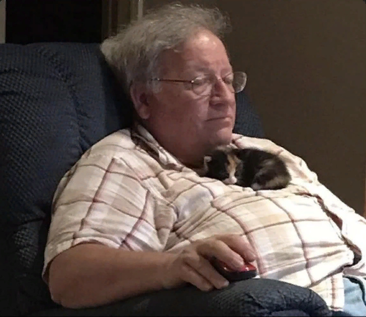 9. «У мого тата ніколи не було кішки. Нещодавно він знайшов цього малюка, що плаче на вулиці, і поселив. Тепер кошеня спить ось так»