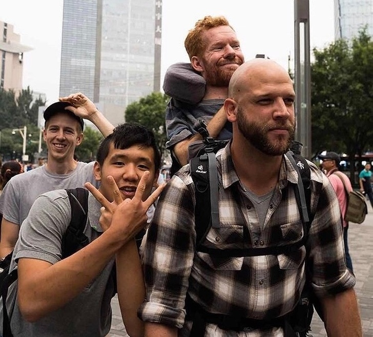 6. У одного з чотирьох друзів м'язова атрофія. Троє інших по черзі носять його на плечах у подорожах, щоб він зміг на власні очі побачити різні країни