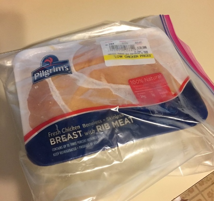 «Чоловік купував продукти і запитав, чи можна покласти курку в морозилку. Я сказала: „Так, просто розділили її на частини і поклади в зіп-пакети“. Вранці заглянула в холодильник і знайшла це»