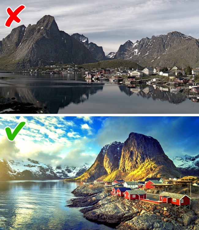 Ось наостанок 2 фото одного і того ж місця в Норвегії. Чим нижнє фото відрізняється від верхнього? Було б дивно думати, що тільки ціною камери. По-перше, фотограф походив якийсь час навколо і знайшов цікавий ракурс: у кадр потрапили і далекі гори, і скеля ближче, і рибальські будиночки. Притому знімав він все ж саме скелю, а все інше служило або фоном, або обрамленням. Він дочекався часу, коли сонце ефектно підсвітило об'єкт зйомки. А він завершив процес тим, що додав своєму творінню яскравості і кольоровості вже під час постобробки.