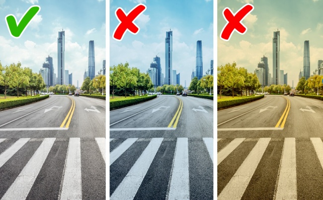 - У гонитві за яскравими фотографіями ми накладаємо різні фільтри, але часто вони виглядають штучно. Для ефекту реалістичності не забудьте звіритися по білому кольору — він повинен залишитися білим. Наприклад, колір зебри на перехресті або колір снігу.