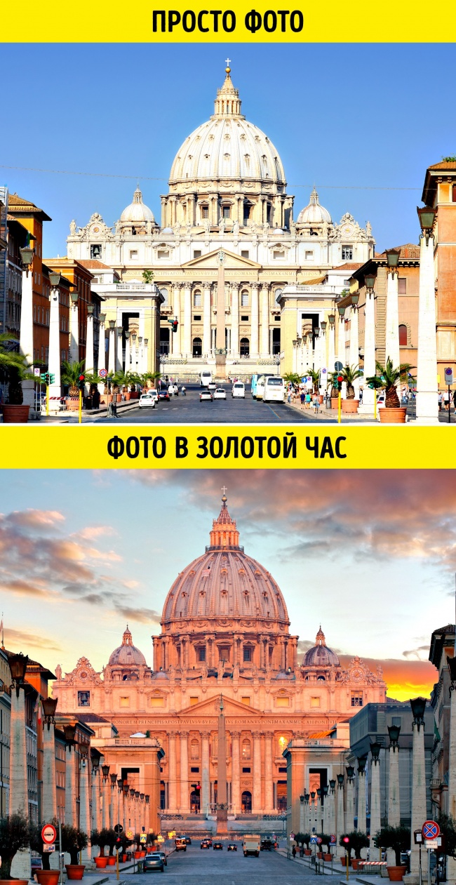 - Золотий час — це годину після світанку і годину до заходу сонця. Сонце в цей час знаходиться низько над горизонтом і як би завдає позолоту на все навколо. Такий м'який світло здатний перетворити будь-яку, навіть саму рядову вулицю, що вже говорити про дійсно красиві місця. Та й портрет в такому світлі буде виглядати крутіше.