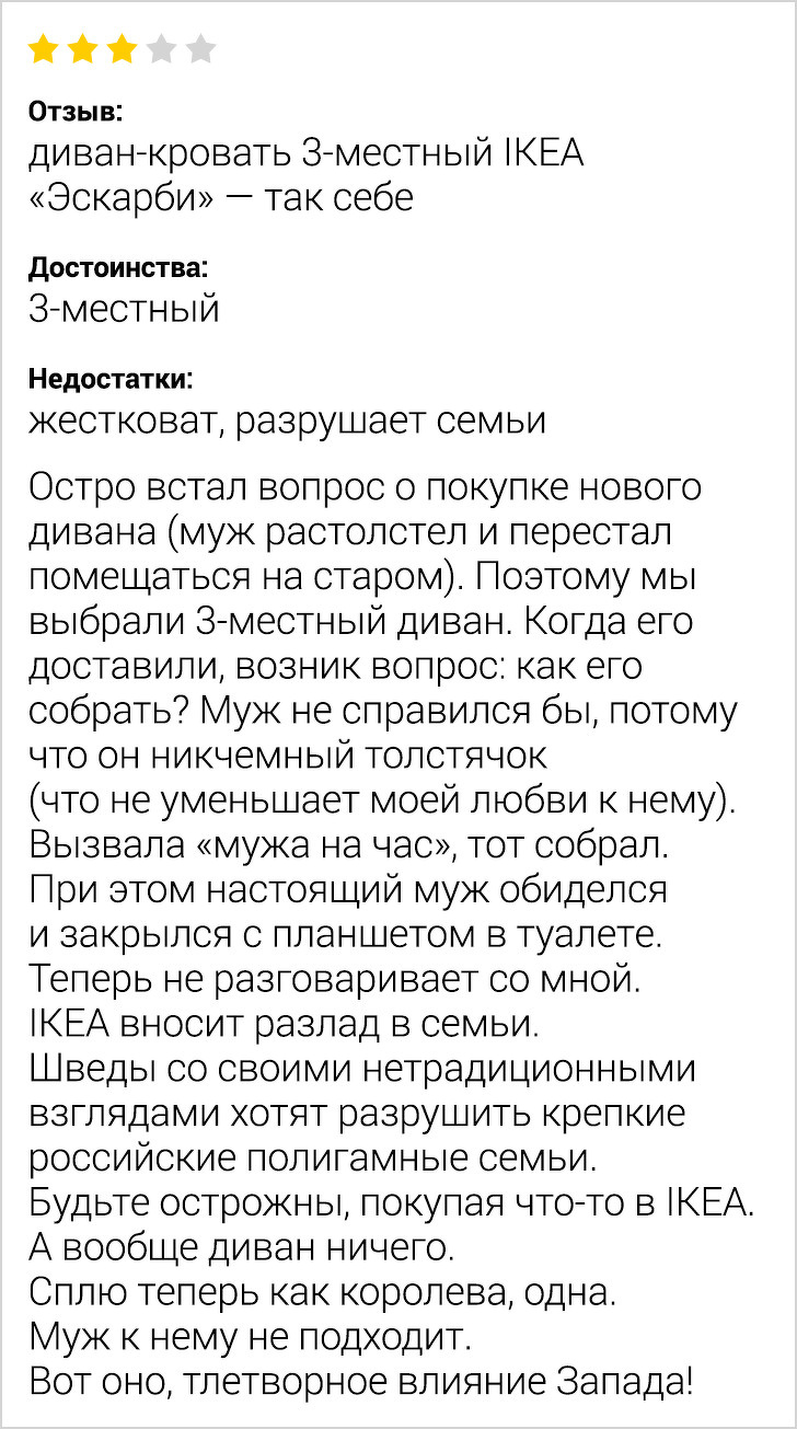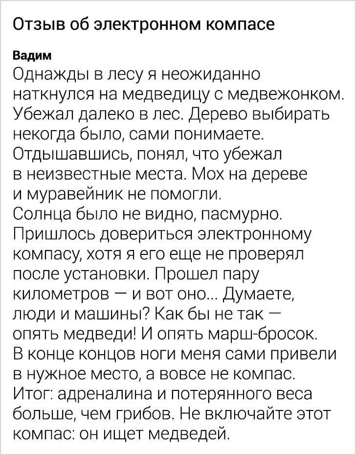 Буває, хочеш придбати якусь річ в інтернеті, читаєш відгуки і знаходиш такі літературні перли, що негайно готовий купити цей товар з-за одного тільки соковитого відкликання. Деякі люди, здається, ніби народжені для того, щоб оцінювати товари і послуги і талановито писати про це.