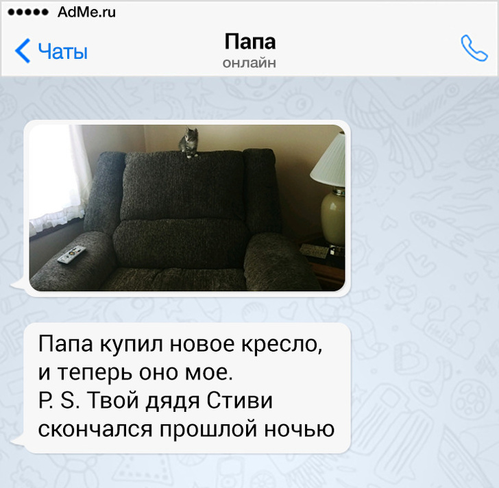 18. «Тато щодня надсилає мені фото кота з прикольними підписами від його особи. А сьогодні ще й це»