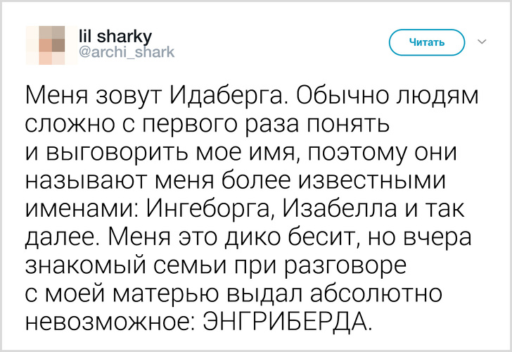Всім неприємно, коли їх називають іншим ім'ям. Але як бути тим людям, яким батьки дали складні імена, або тим, хто живе в іншій країні? Дівчина з красивим ім'ям Идаберга, після того як її примудрилися назвати Энгрибердой, поділилася у твіттері своїм обуренням, ну і за неї підключилися інші.