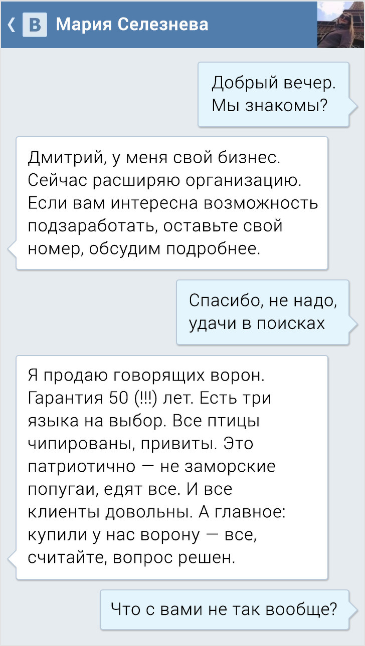 Нудні робочі чати перетворюються в захоплююче чтиво, якщо хоча б в одного з колег відмінне почуття гумору. Але справжні шедеври ділового листування з'являються по волі випадку. Наприклад, можна просто спокійно сидіти за комп'ютером на роботі і отримати привабливу пропозицію купити розмовляючу ворону — таке, погодьтеся, не кожен день відбувається.