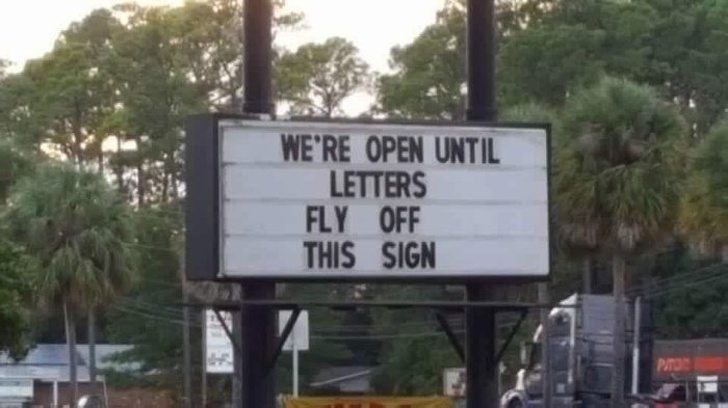 Напис на щиті у Флориді на шляху урагану «Майкл»: «Ми відкриті до тих пір, поки із цього знака не почнуть зриватися літери».