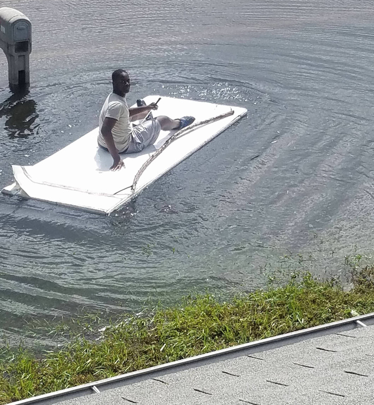 12. З-за урагану район затопило, і цей хлопець вирішив використовувати дерев'яну хвіртку в якості човни