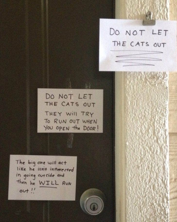 «Котів не випускати». «Котів не випускати. Вони спробують вибігти, коли ви відкриєте двері!» «Один з них, найбільший, буде вести себе так, ніби нікуди вибігати не збирається. Але при першій можливості він вибіжить!»